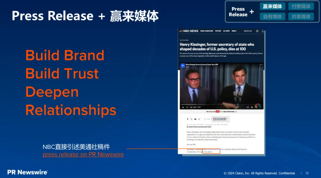 用案例來說。去年年底美國的外交官基辛格去世時,權威媒體NBC News在報道這種突發性新聞的時候,直接引用了美通社發布的官宣稿件,這種經由正規新聞發布機構發布的內容,自然更容易贏得權威媒體的關注與信任。